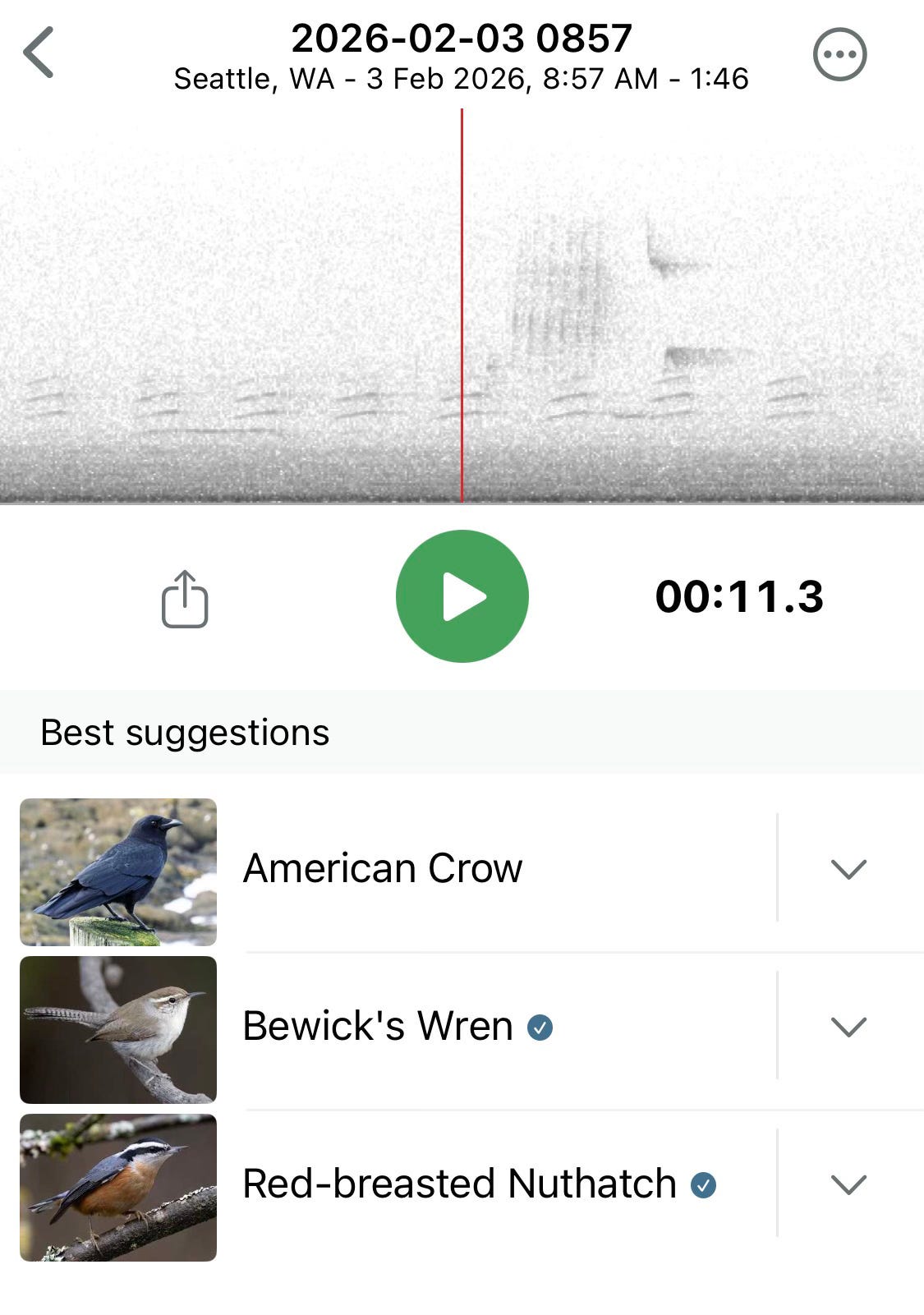 What occurred to me, as I was reading the above words in Quantum Listening, is how the recorder was the spark for her revelation about listening. Likewise, recording birdsong and seeing it rendered visually and connecting it to specific birds has been a spark for me. The action of listening is opened up by the action of recording. I experienced this feeling before, when I had the opportunity to be an Artist in Residence at Jack Straw Center. I learned some field recording techniques and was amazed at how my attention shifted when I was holding a microphone, wearing headphones. The technology, rather than distancing me from my surroundings, truly amplified them. Even without a great microphone, headphones, or other equipment, the phone and app can function in this way. By amplifying my awareness of the birdsong, I suddenly notice and really listen. This is hopeful. And even more so, once practicing listening in this way, I continue to do it even without the device, tuning my senses outwards.